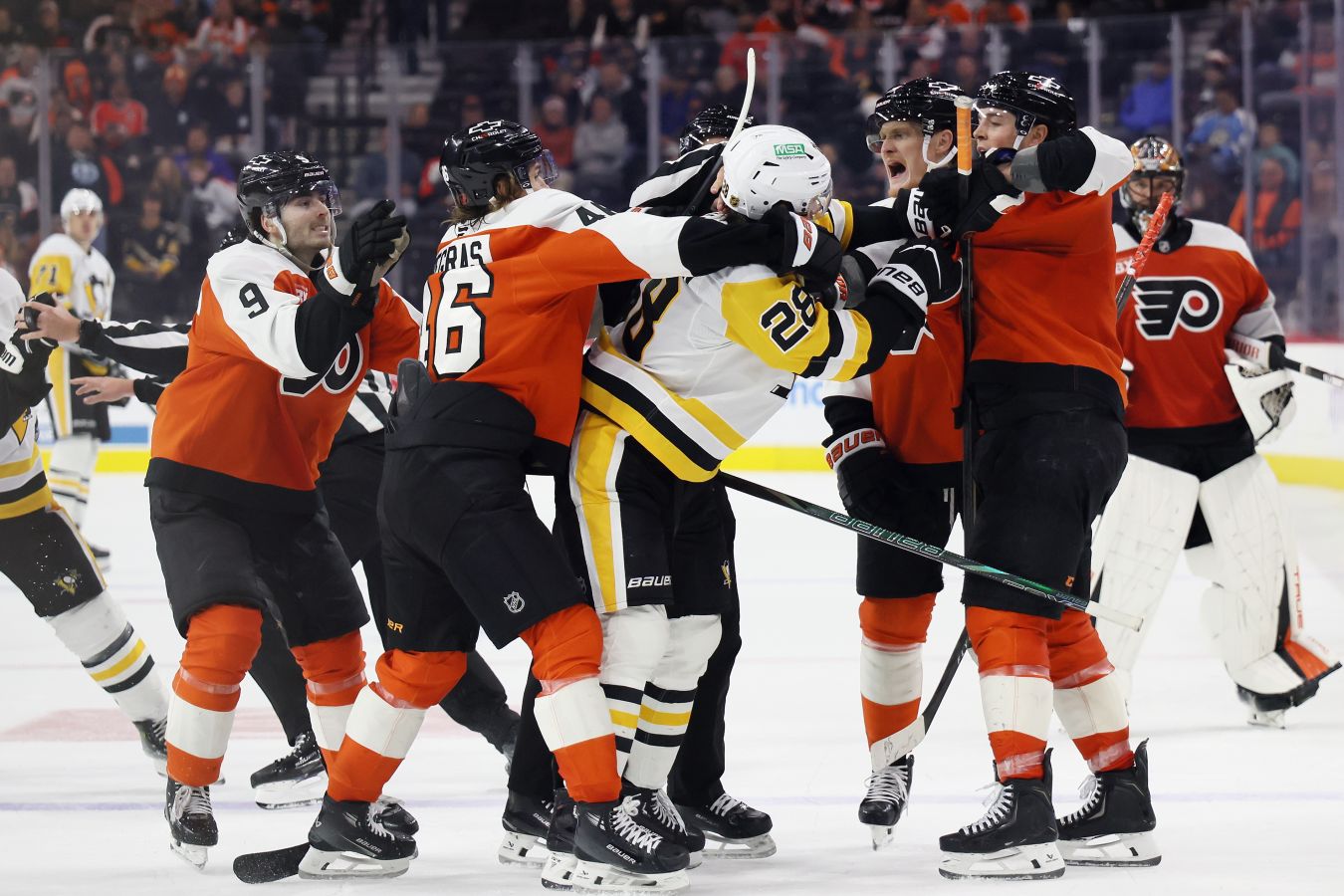 По правилам НХЛ именно такая ситуация не наказывается штрафом, так что игра продолжилась в формате «четыре на три». Большинство «Питтсбург» не реализовал. Вскоре после этого уже Малкин получил две минуты, и Тайсон Фёрстер поставил точку в матче за 28 секунд до конца овертайма. «Филадельфия» праздновала, но «пингвины» не спешили покидать площадку, сигнализируя, что было положение вне игры. После просмотра отменили и этот гол.