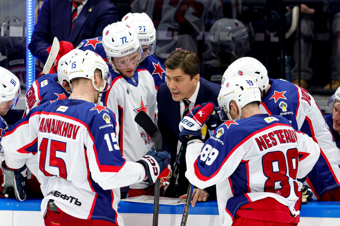 В Омске «Авангард» принимал «Нефтехимик». «Ястребы» реализовали большинство в начале игры усилиями Константина Окулова, признанного КХЛ лучшим нападающим октября. После этого на первый план в игре вышли арбитры, выписавшие при совершенно равной и негрязной игре семь подряд удалений хозяевам площадки. В редких промежутках игры в равных составах Игорь Мартынов удвоил преимущество «Авангарда», в меньшинстве омичи действовали здорово, но с седьмой попытки всё-таки пропустили от Данила Юртайкина. В конце второго периода после пропущенного удаления на Прохоркине не выдержал Ги Буше, получивший в результате малый штраф за оскорбление арбитров. В третьем периоде «Нефтехимик» ещё раз сыграл в большинстве, но больше так и не сумел забить Никите Серебрякову.