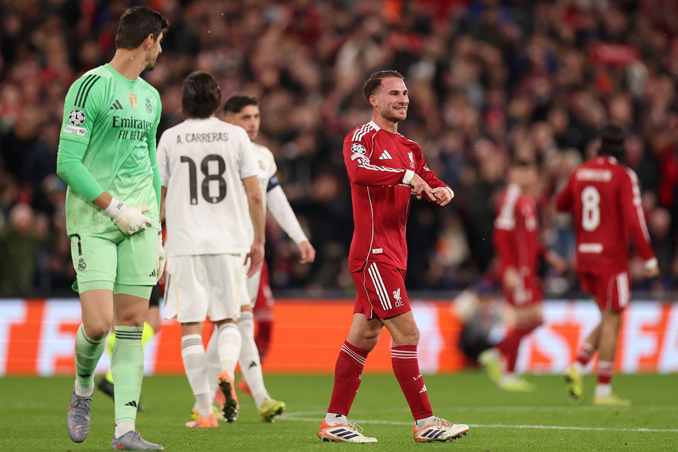 В конце концов, со стандарта команда Слота и забила. По истечении часа матча Беллингем привёз штрафной, срубив Гравенберха и заработав предупреждение, а Собослаи здорово подал в нужную точку по центру ворот. Мак Аллистер занял верную позицию и ударом головой с линии вратарской отправил мяч «между ушей» Куртуа. Тут даже Тибо не успел среагировать. Было подозрение на офсайд, гол проверялся VAR. Однако на сей раз видеосудьи не разочаровали «Энфилд».