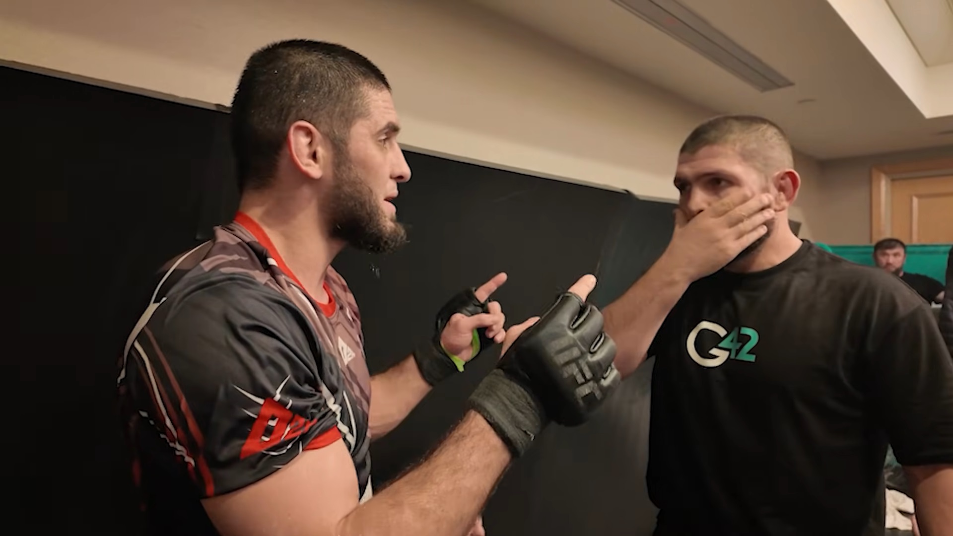 В соцсетях опубликовано видео, на котором запечатлен спор Хабиба Нурмагомедова с Исламом Махачевым и Умаром Нурмагомедовым.