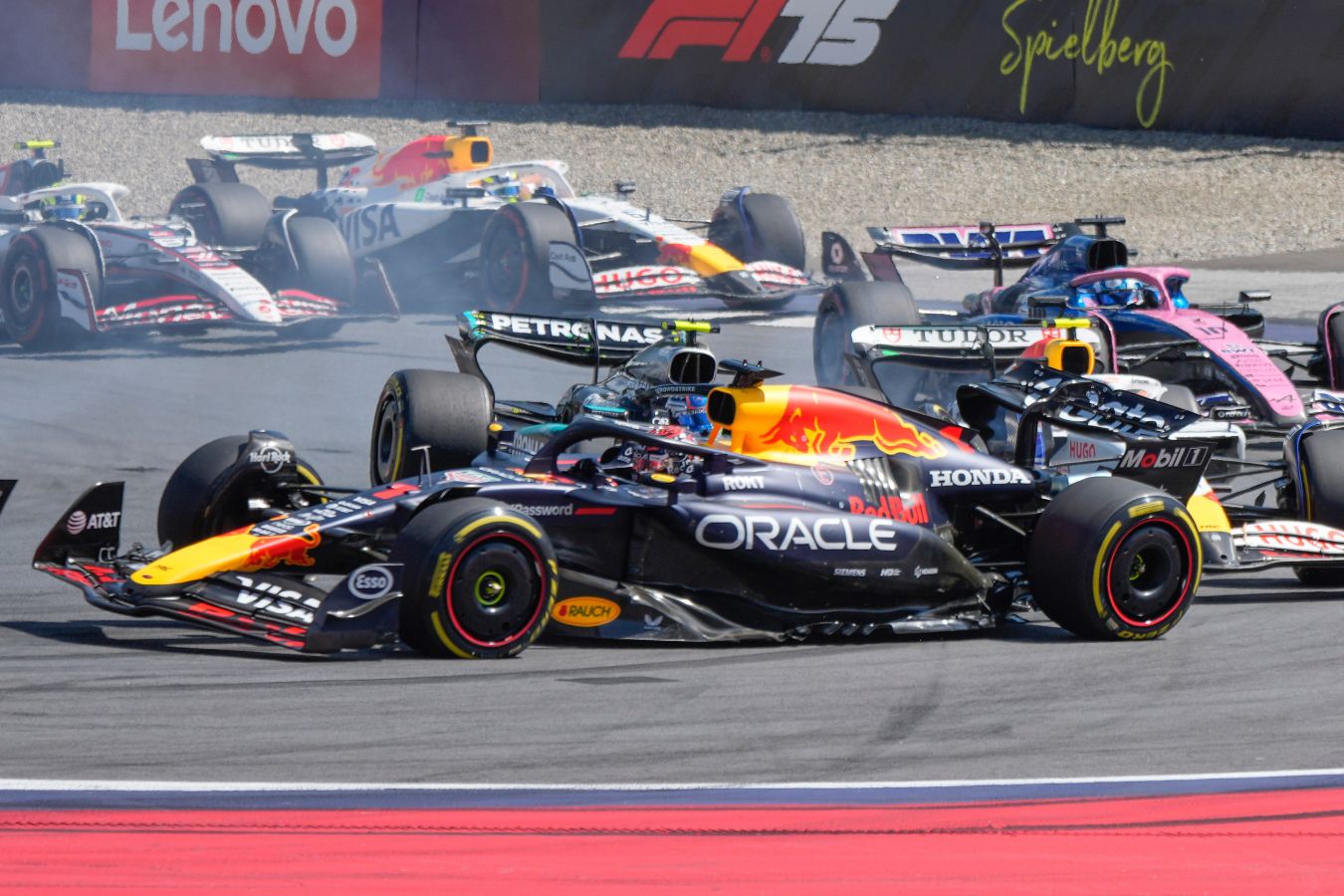 Снова сейфти-кар в концовке мешает Ферстаппену. Когда после вылета Антонелли все поехали за свежими шинами, у «Ред Булл» из свежих комплектов резины оставался только «хард», что ставило Макса в проигрышное положение относительно преследователей на «софтах». Не прогрев как следует резину, Макс ошибся при рестарте в последнем повороте, пропустил Леклера и попал под атаку Расселла. Пилот «Ред Булл» срезал поворот, после чего командный мостик ошибочно приказал своему лидеру пропустить Джорджа.