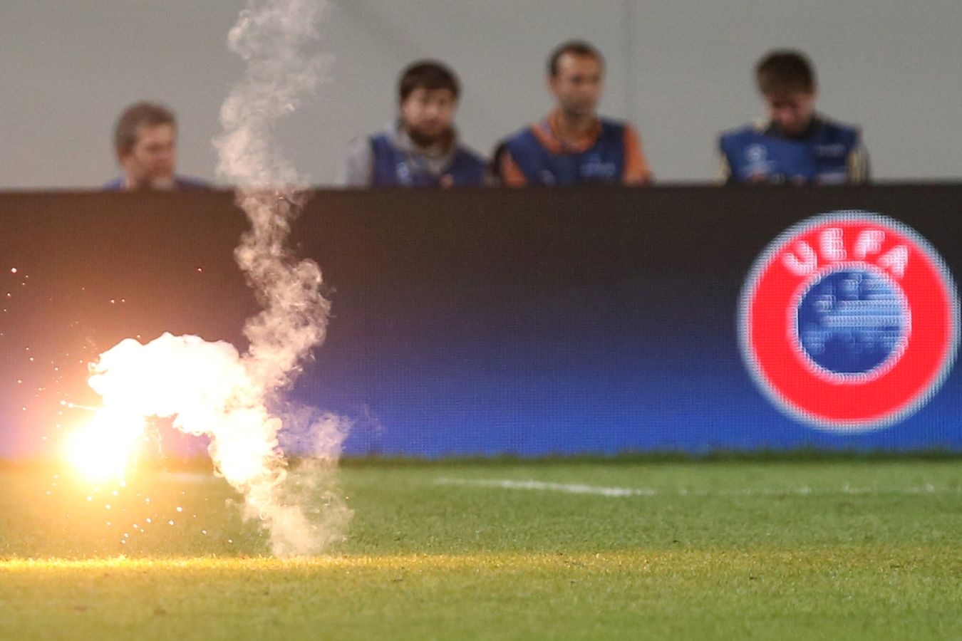 Болельщики «Айнтрахта» сломали часть ограждения, отделяющего их от болельщиков «Барселоны», повредили сиденья и туалеты. Кроме того, они подожгли семь дымовых шашек и бросали стаканчики с алкоголем и мочой в сторону болельщиков «Барселоны», что вызвало волну возмущения и напряжения на трибунах. В результате инцидента атмосфера на стадионе стала крайне накалённой.