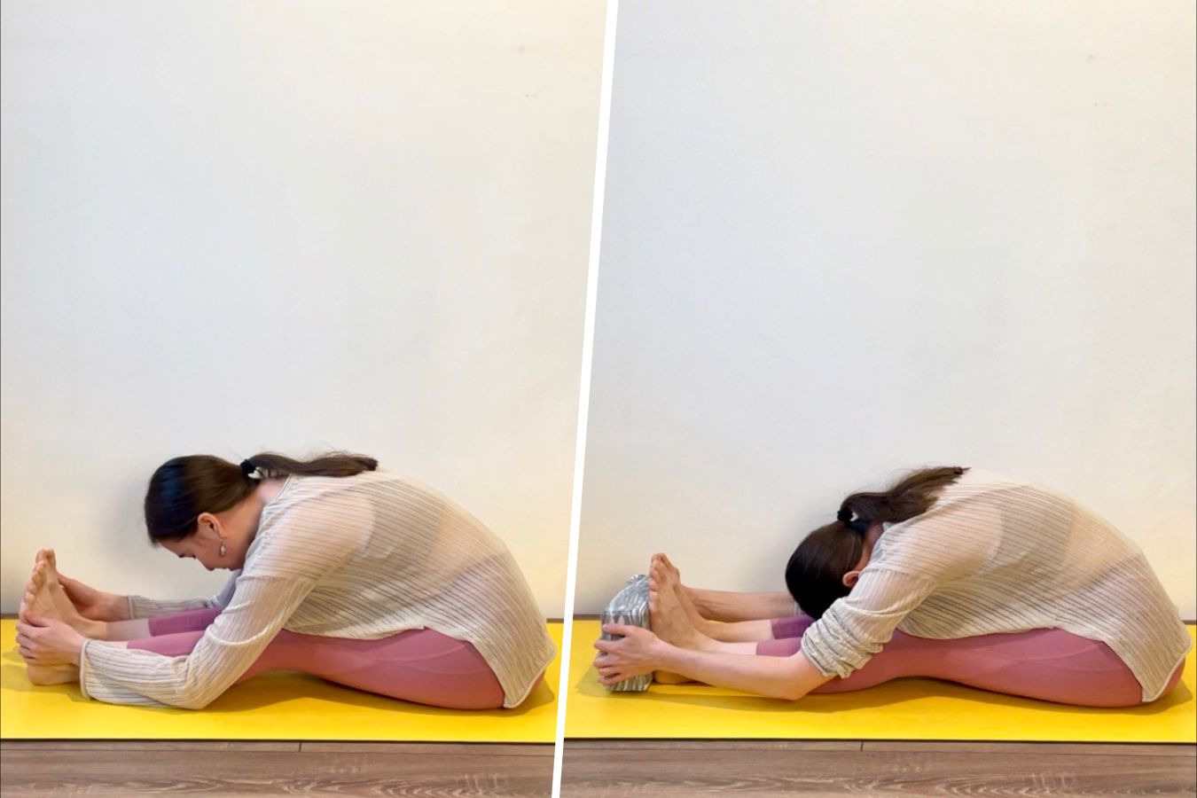 - Сядьте на коврик, подложите под таз опору, подушку или блок.