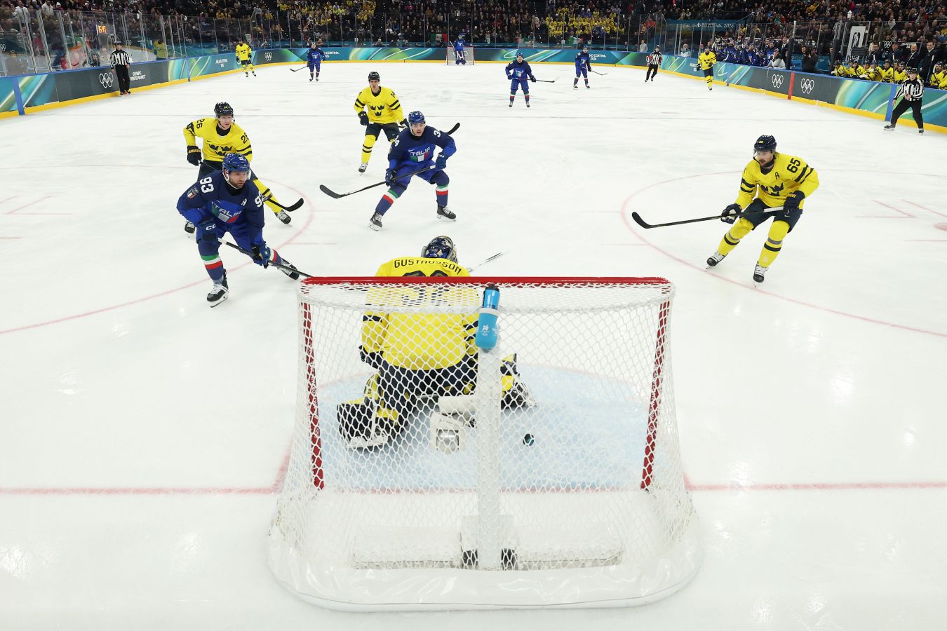 Вратарь сборной Швеции Филип Густавссон допустил ошибку в начале матча с Италией на хоккейном Олимпийском турнире в Милане, позволив сопернику открыть счёт в игре.