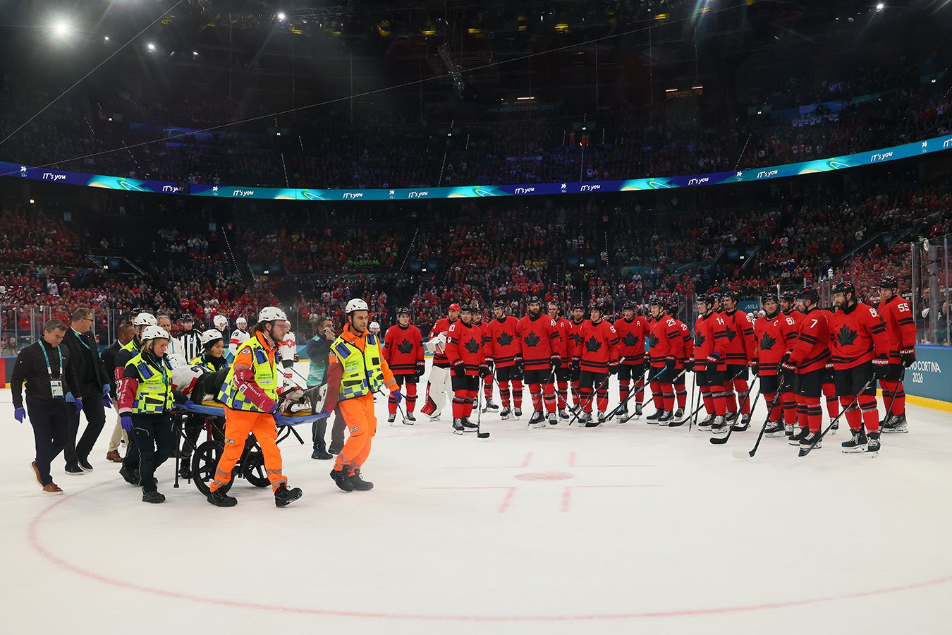 Все игроки сборной Канады вышли на лёд в момент транспортировки за пределы площадки получившего серьёзную травму нападающего сборной Швейцарии Кевина Фиалы.