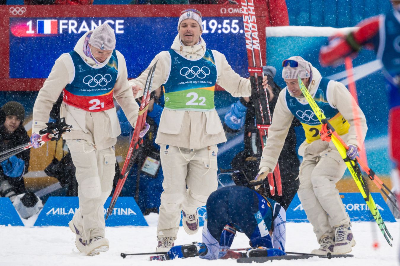 Партнёры подхватили его под руки, хотя Эрик опускался на колени. Даже во время традиционной фотографии Перро с трудом стоял на ногах, а потом его подхватил Кентен Фийон Майе. Постепенно Эрик пришёл в себя и даже нашёл в себе силы улыбнуться. Фабьен Клод извинялся перед партнёрами, а самым счастливым был Эмильен Жаклен – он стал-таки олимпийским чемпионом.