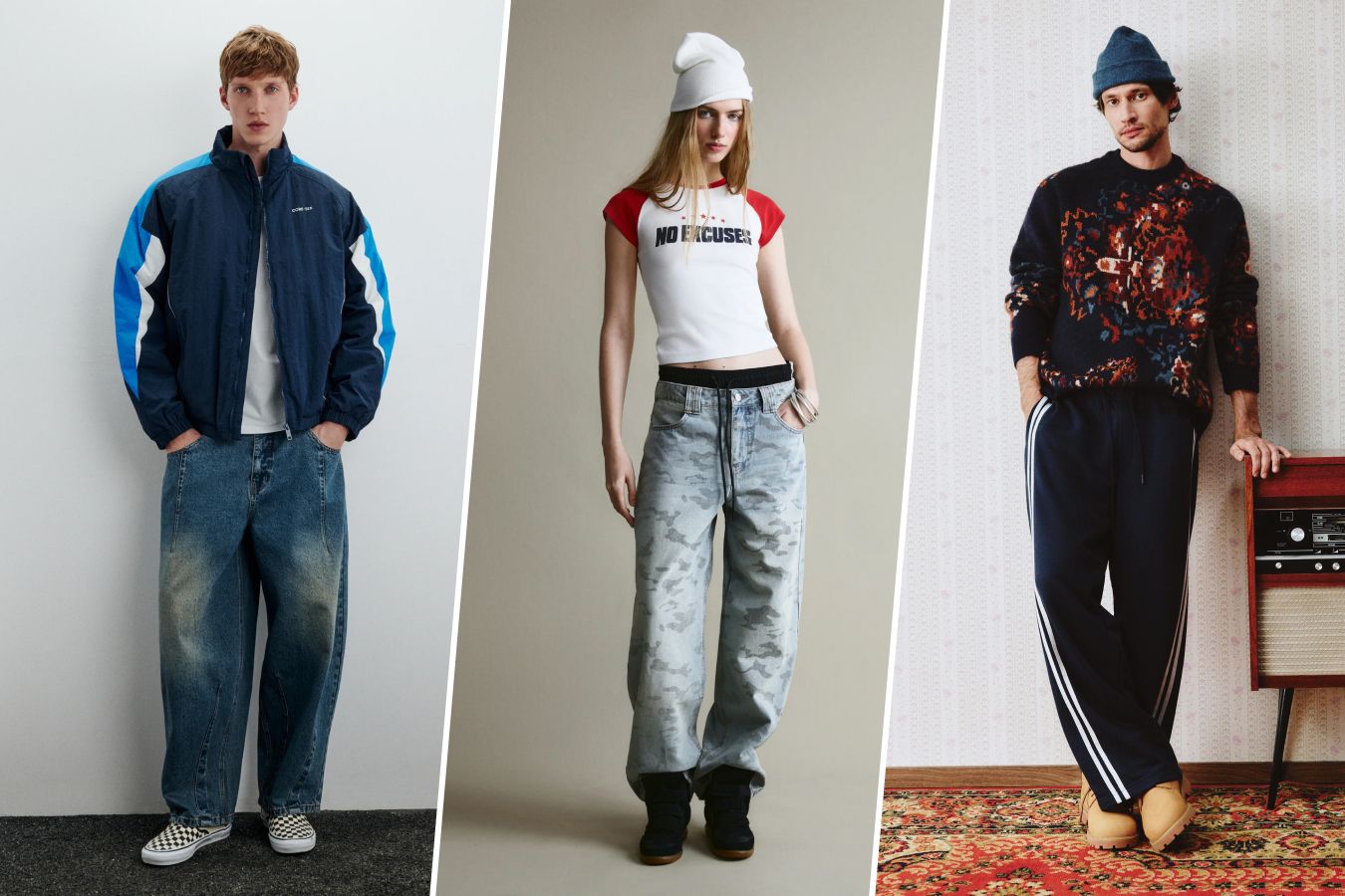Заниженные пояса на спортивках, неоновые вставки и логотипы — это база 90-х, которая вернулась. В стритстайле добавляют джинсы-клёш и цепи, однако спорт остаётся в центре. Кроссовки Samba от adidas — хит продаж. Ностальгия по Бритни Спирс и «Сексу в большом городе» толкает всех в этот микс комфорта и бунта.