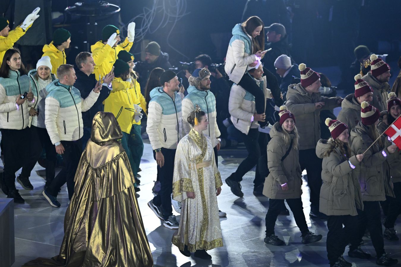 Российский лыжник Савелий Коростелёв нёс на плечах свою соотечественницу Дарью Непряеву во время церемонии закрытия Олимпийских игр — 2026. Мероприятие в эти минуты проходит на стадионе «Арена ди Верона» в Вероне. В прямом эфире торжественное мероприятие показывает Okko.