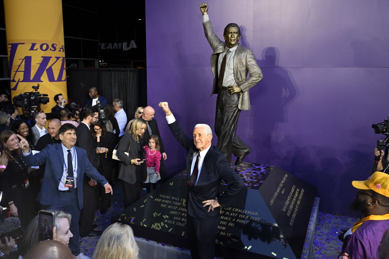 В белом гольф-каре и полосатом пиджаке Armani 80-летний Пэт Райли подъезжает к месту церемонии. «Пэт, мы тебя любим!» — кричат фанаты, а он, улыбаясь, приветственно машет рукой. На сцене его ждали статуи других легенд — Джерри Уэста и Чика Хирна. Осознав, в какой компании оказался, Райли не смог сдержать слёзы.