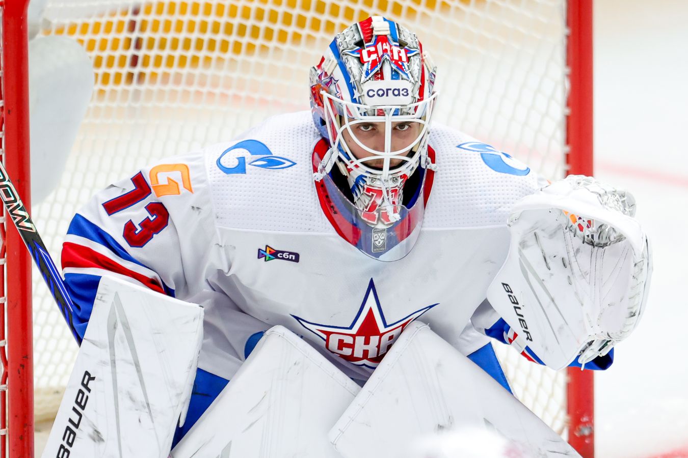Голкипер СКА Артемий Плешков показал свою новую маску. Хоккейный шлем выполнен в клубных цветах с изображением головы коня и игровым номером вратаря.