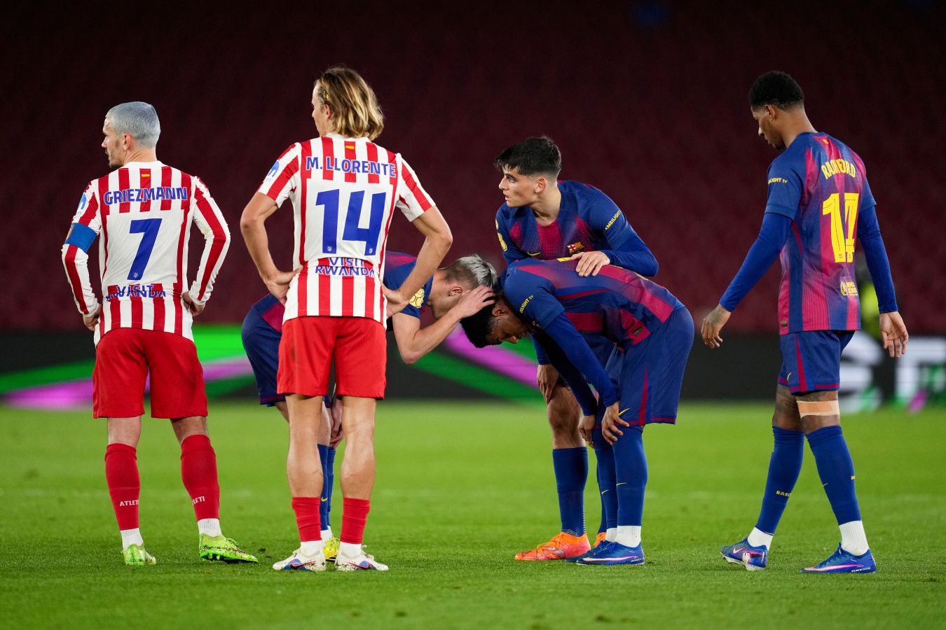 Диего Симеоне максимально насытил оборону. Абсолютно все футболисты «Атлетико» обороняли преимущество на своей трети, поначалу совсем не стараясь взять мяч под контроль и отбиваясь в надежде на контратаки. В центре защиты на подборах отрабатывал даже Гризманн. Согласно статистике, каталонцы в первые полчаса устроились на владение в районе 73%. По ощущениям, были и все 80%.