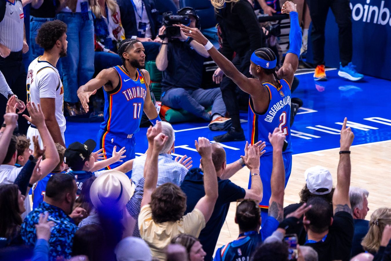 До конца четвёртой четверти всего 8,5 секунды. Аджай Митчелл отдал пас, и Гилджес-Александер оказался под пристальным присмотром Спенсера Джонса. Однако он резко шагнул назад, создал себе шанс для броска — и попал тяжёлый трёхочковый. На табло оставалось около двух секунд. Тайм-аутов у «Денвера» не было, и Аарон Гордон, получив мяч после быстрого ввода, запустил отчаянный бросок почти через всю площадку — мимо.