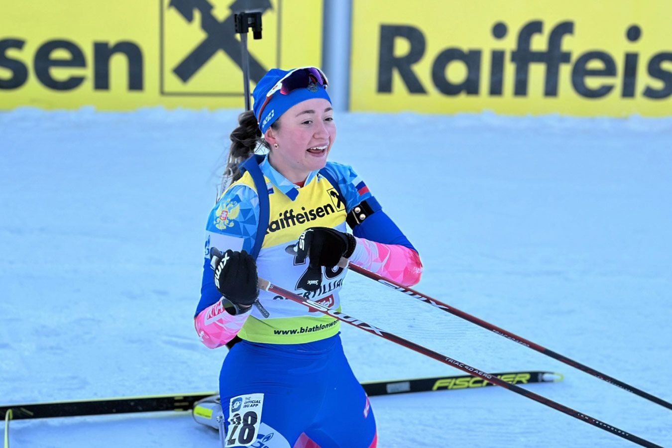 Мишень, по которой стреляла биатлонистка, принадлежит Анастасии Томшиной. Спортсменка изготовилась на третий щит, однако вела стрельбу по второму.