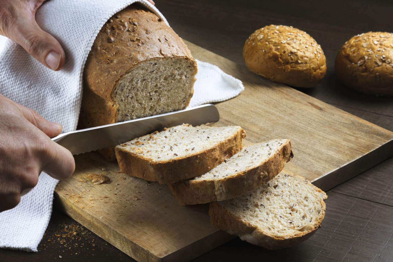 • Резать лучше зубчатым ножом. Он меньше сминает мякиш и даёт ровные кусочки.