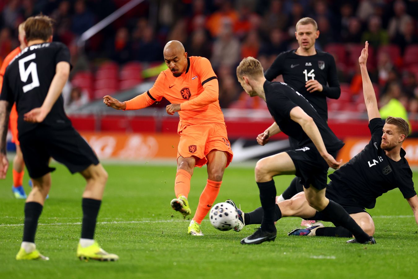 В середине первого тайма счёт открыл нападающий гостей Андреас Шельдеруп. На 35-й минуте защитник сборной Нидерландов Вирджил ван Дейк восстановил равновесие. На 51-й минуте полузащитник Тейани Рейндерс вывел «оранжевых» вперёд.