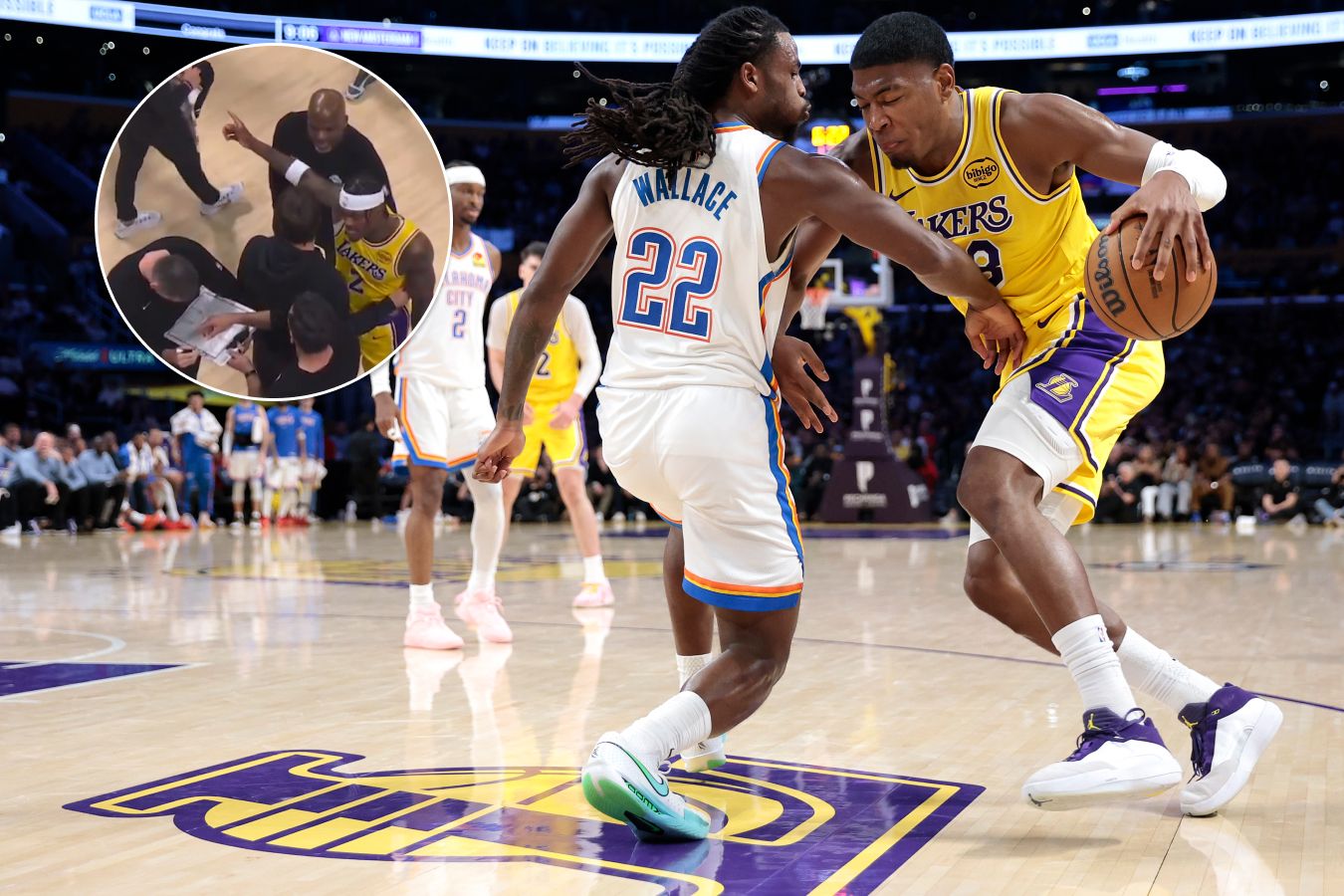Для «Лейкерс» матч начался с больших проблем — из-за отсутствия сразу нескольких лидеров (Дончича, Ривза и Леброна) атаковать было некому. Несмотря на это, первую половину играли более-менее на равных, в основном благодаря удачной защите. Но под конец второй четверти «Оклахома» резко увеличила отрыв. После этого гости полностью контролировали матч, а у «Лейкерс» пропала всякая организация в нападении, да и в защите всё стало плохо.