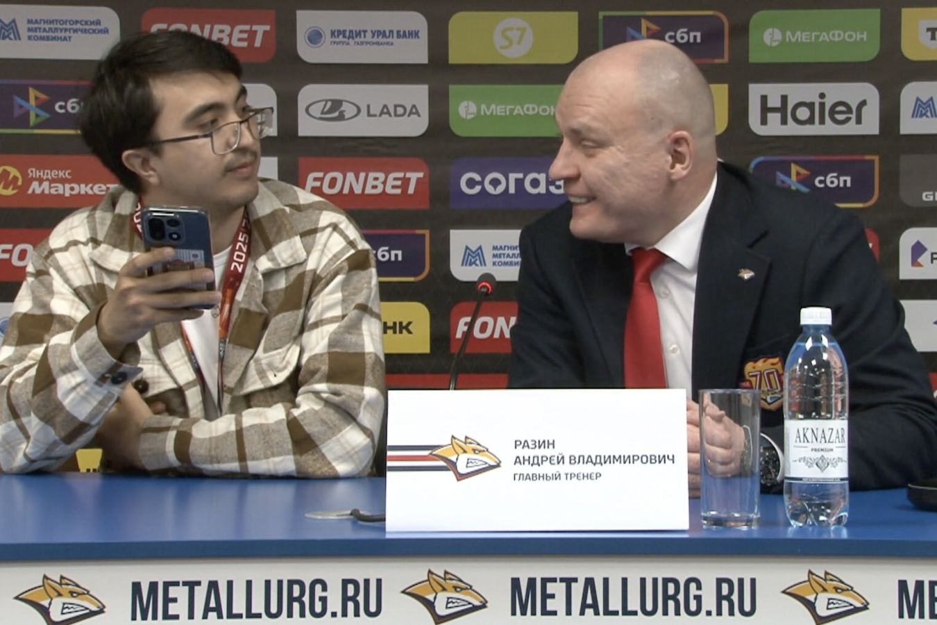 – А можно смурфика из Казани сюда посадить? Тебя покажут на всю страну. Пошли! Чего ты боишься? Алексей (Обращается к пресс-атташе «Металлурга» Алексею Мишукову. — Прим. «Чемпионата») – Разреши ему. Я ему позадаю вопросы. Его покажут на всю страну! Пошли. Давай поговорим с тобой.